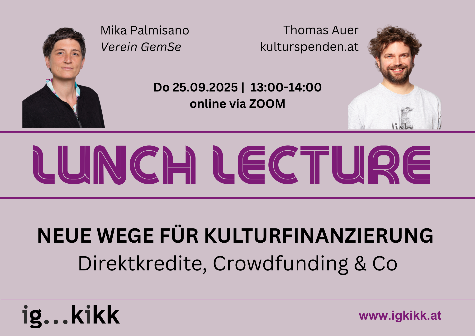 In dieser Lunch Lecture geben Mika Palmisano (Verein GemSe) und Thomas Auer (kulturspenden.at) praxisnahe Einblicke in Direktkredite, Crowdfunding und andere Formen gemeinschaftlicher Finanzierung. Elena Stoißer (IG KiKK) moderiert das Gespräch und beleuchtet mit den Gästen, wie solche Modelle gerade jetzt neue Spielräume für Kulturinitiativen in der Region schaffen können.