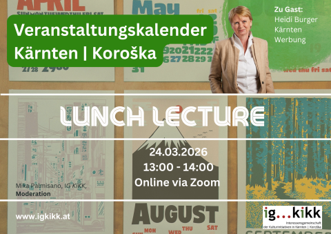 Die Lunch Lecture im März widmet sich einer wichtigen Neuerung für die Kärntner Kulturlandschaft: dem zentralen Veranstaltungskalender. Heidi Burger wird uns die neue Plattform vorstellen und alle Fragen zur Anmeldung, Nutzung und den Vorteilen beantworten.